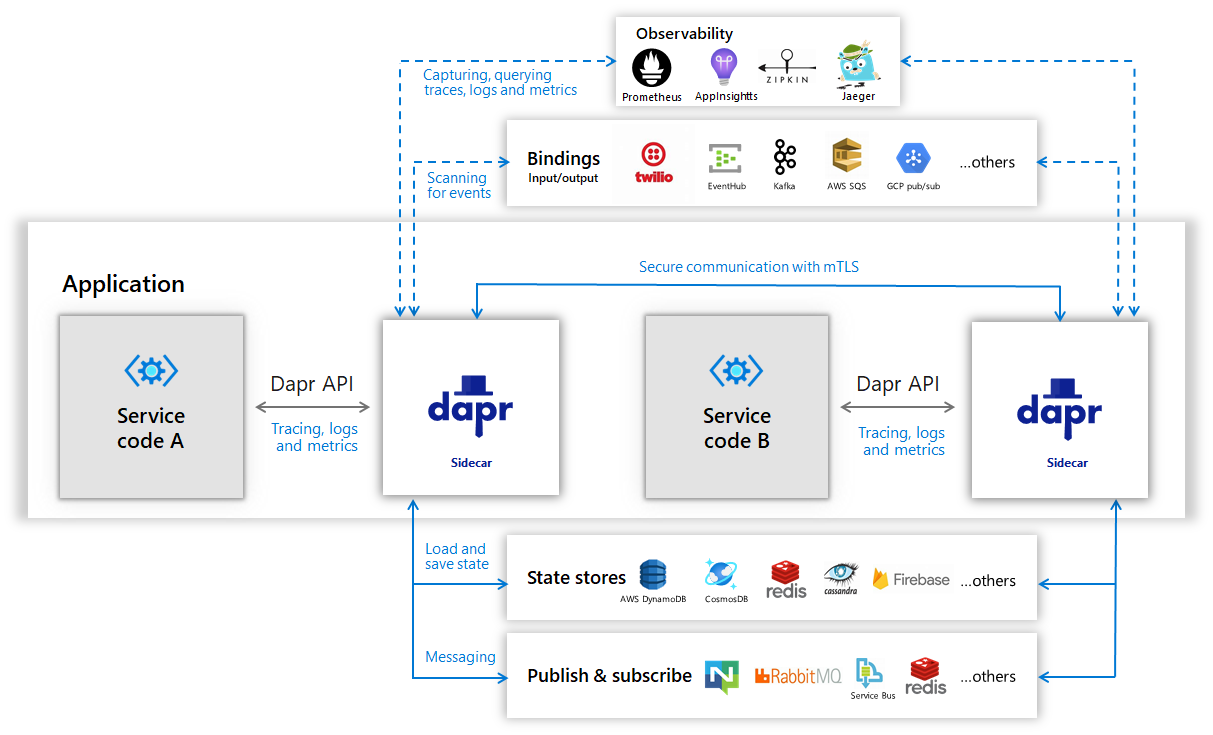 准确来说Dapr并不单单解决服务治理问题,而是完全基于云原生理念诞生的产物,Dapr希望将一切都抽象成云资源,代码通过对云资源的依赖来实现相应的业务。为了让各种语言都有统一的实现规范,Dapr给很多流行的语言提供了SDK,又结合了Sidecar思想,将真正实现逻辑的部分都封装在Sidecar当中,此时的Sidecar就是Dapr的运行时,有多个Sidecar,那就会出现多个运行时。业务代码会先通过SDK沟通Sidecar,再历经各个Sidecar的相互作用来实现具体需求,其中就包含了服务治理能力。