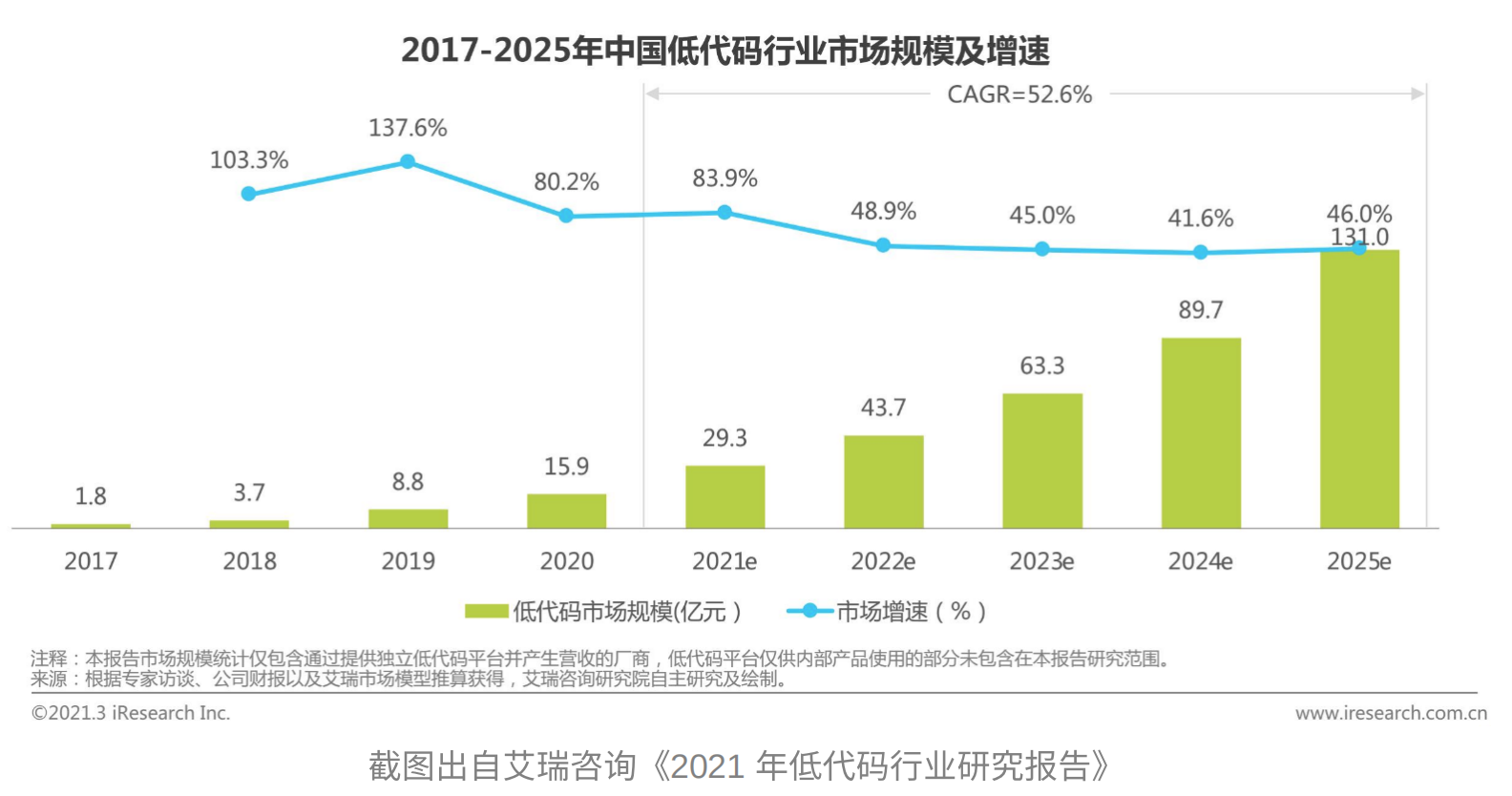 同期,国内的低代码⼚商也开始尝试布局,2018 年左右,互联⽹巨头阿⾥、腾讯、百度的纷纷⼊局,也间接为整个⾏业奠定了⽅向。据艾瑞咨询《2021 年低代码⾏业研究 报告》中所⽰,截⾄ 2020 年,中国低代码市场共有 59 起融资事件,融资规模达亿元 以上者依然有 13 起之多。⽽同期市场规模也逐年增⾄ 15.9 亿(2020年),据测算, 该市场规模将于 2025 年达到 131 亿,未来 5 年复合增速为52.6%。