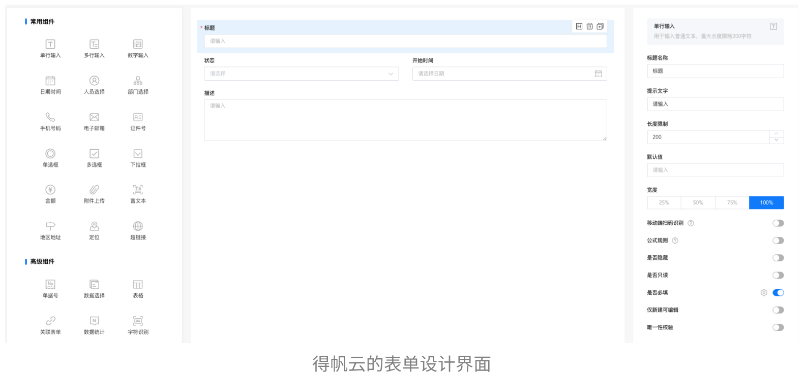 表单驱动型平台的核⼼编辑界⾯其实只有两个,表单设计与流程设计,通过对表单的 设计完成对其抽象数据的建模,并同步绑定数据的创建/编辑界⾯,再借由流程设计, 来定义数据的流程状态,以及不同状态下的可操作⾓⾊,字段的可⻅/可编辑权限等。