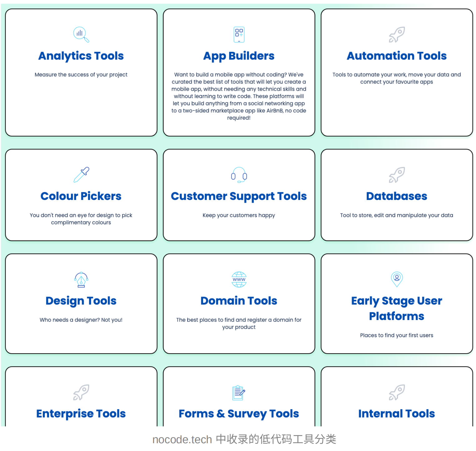 在资讯⽹站 nocode.tech 中所收录的低代码⼯具中,根据⼯具的能⼒范围,将其分为如表单设计、应⽤设计、市场⼯具、客户⽀持⼯具、分析⼯具、⾃动化⼯具、数据库⼯具等在内的 37 种类型,截⽌⽬前,已收录的低代码/⽆代码⼯具服务超过 200 款。