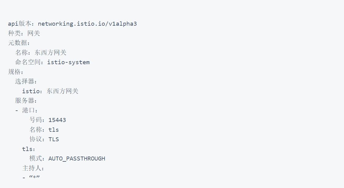 该字段是东西向网关用来将流量转发到正确的网状应用程序的字段。它需要匹配 istioctl proxy-config listener 上面命令中显示的网格应用程序的侦听器。