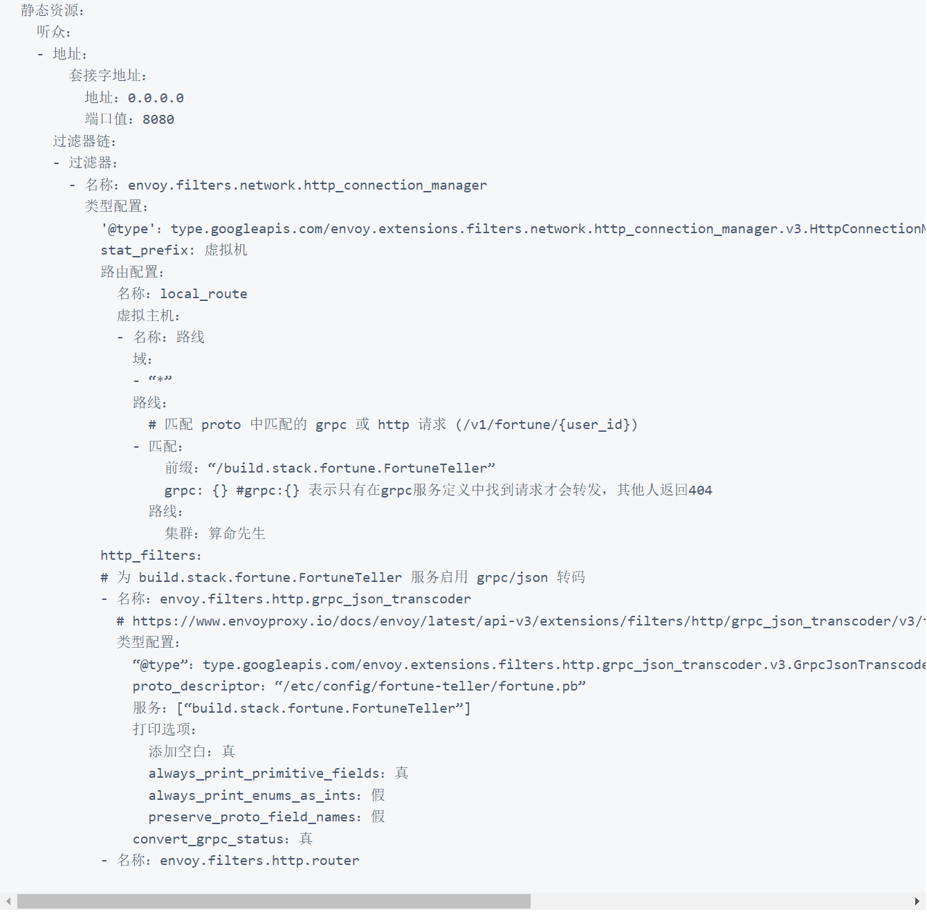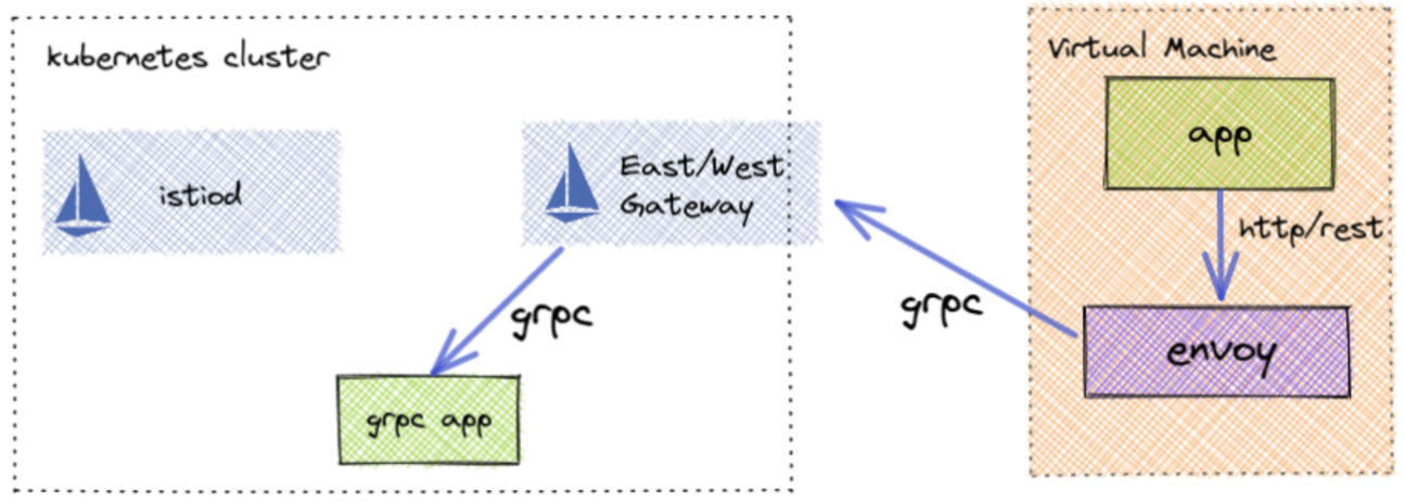 要使基于 HTTP REST 的应用程序能够与基于 gRPC 的应用程序通信,请更新侦听器以进行转码。这要求网格应用程序的原型定义也存在于虚拟机上。