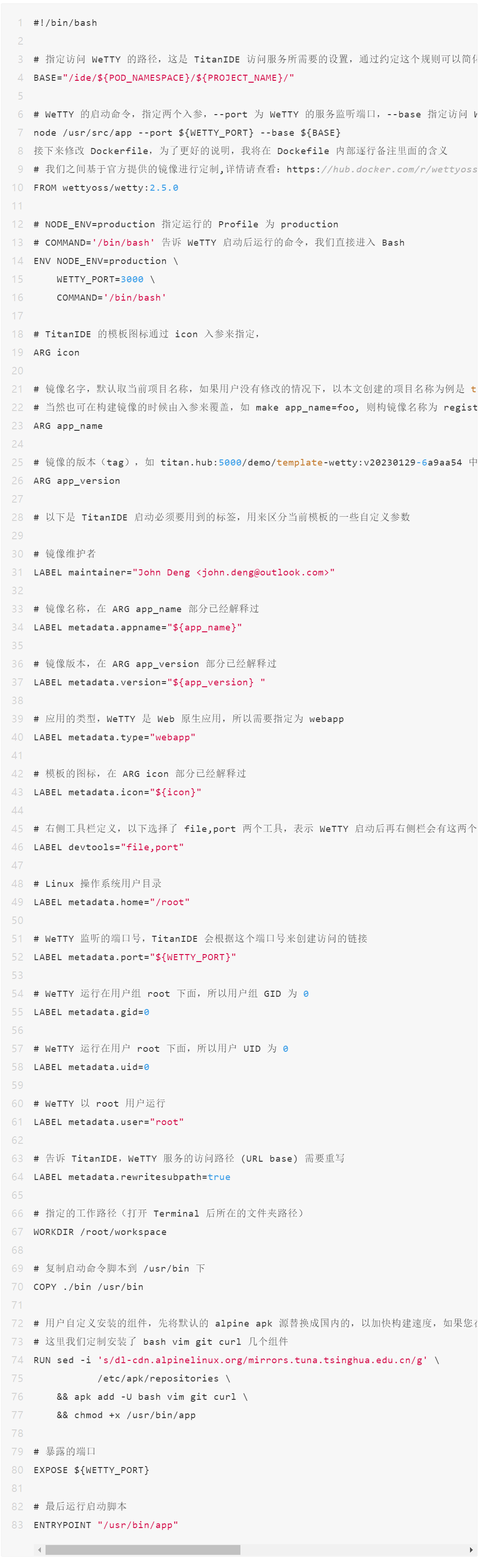 WeTTY 官方镜像默认使用 alpine 基础镜像,而 WeTTY 也主打远程 SSH 连接,对于 TitanIDE 这种开发环境来说,不是很友好,alpine 作为服务运行很好,但是作为开发环境就力不从心了。