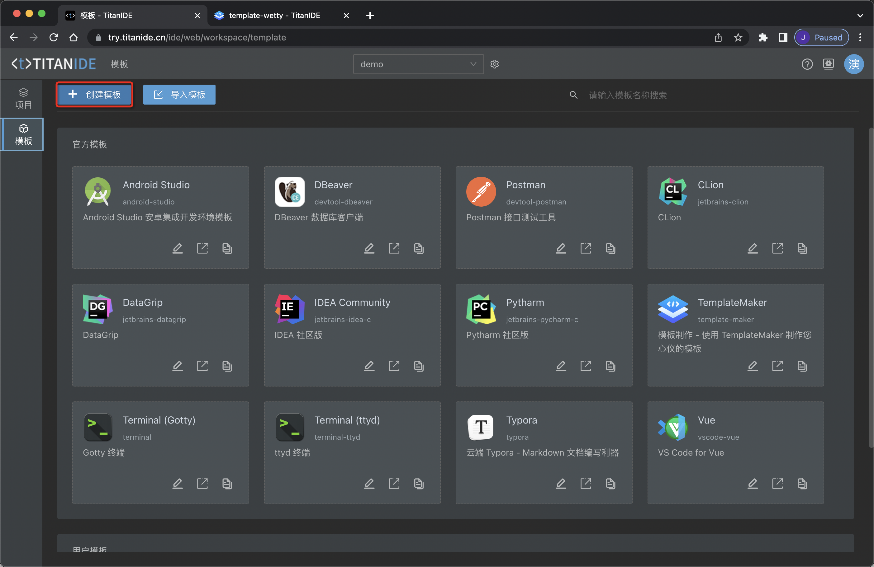 在 TitanIDE 上构建模板镜像,需要通过 TemplateMaker 模板来创建一个项目 template-wetty。