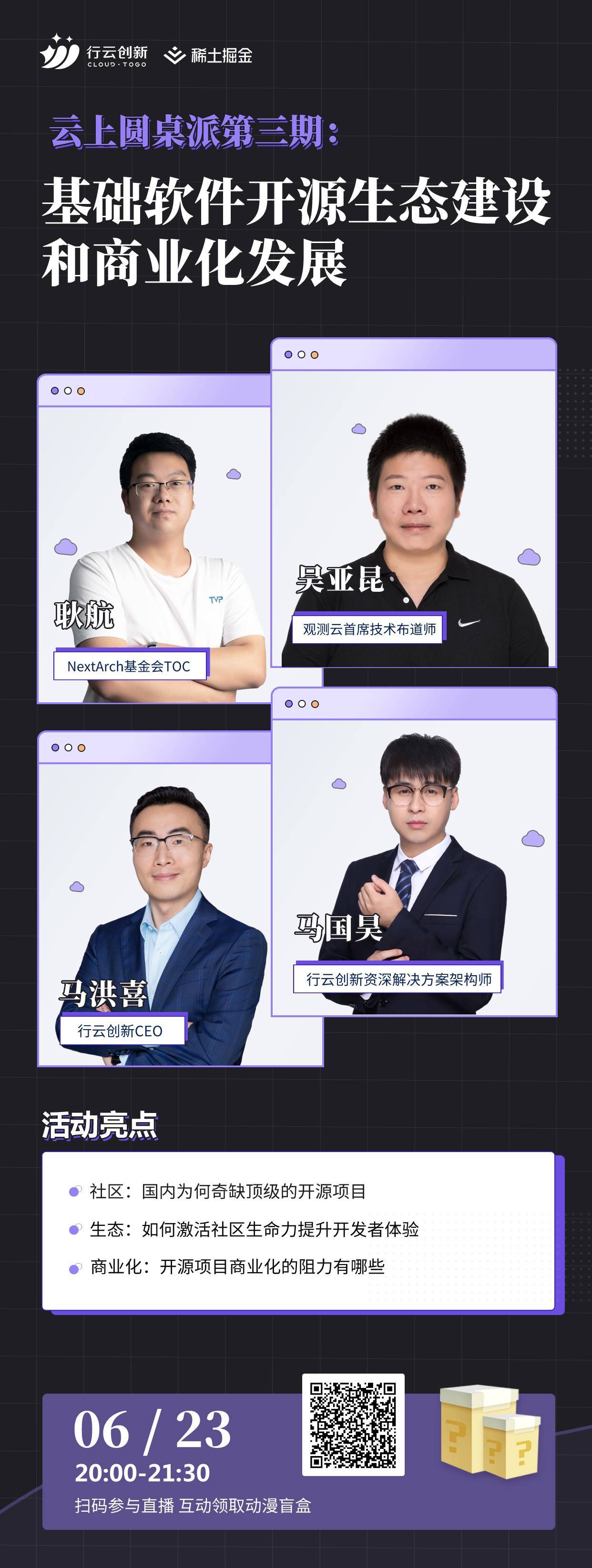 6月23日晚上20:00,云上圆桌派第三期《基础软件开源生态建设和商业化发展》即将开启,活动邀请NextArch基金会TOC耿航,观测云首席技术布道师吴亚昆,kaiyun开云创新资深解决方案架构师马国昊三位大咖和kaiyun开云创新CEO马洪喜一起对国内的开源生态现状、社区的建设及商业化发展等多个问题一起展开讨论。
